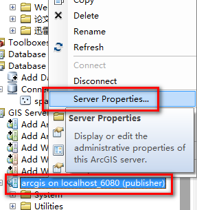 - 为服务配置数据库连接属性。在选择“是否跟发布的数据库连接相同连接(same as pubilisher database connection)”选项时,应注意arcgis server服务登录的账号是否为本地账户(打开“运行”,输入services.msc,找到arcgis server 服务,右键属性,打开登录标签,查看是否为本地系统账户),如果是就勾选。