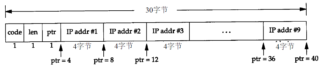 - len是RR选项总字节长度,在这种情况下为39(ping程序总是提供39字节的选项字段,最多可以记录9个IP地址,尽管可以为RR选项设置更小的长度)。