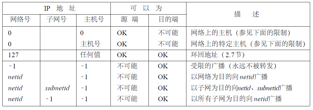 - 表的头两项是特殊的源地址,中间项是特殊的环回地址,最后四项是广播地址。